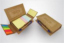Blocos de anotações ecológico (amarelo grande, verde, rosa e azul médios), com post-it (amarelo com aproximadamente 50 folhas), marcadores de página ecológico coloridos ( (verde, amarelo, rosa e laranja aproximadamente 25 marcadores cada cor) e caneta reciclável. Bloco com aproximadamente 150 folhas. Medidas: 18,2 cm x 9,5 cm x 2,3 cm. Uma gravação já inclusa.