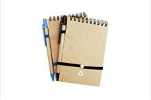 Bloco de anotações ecológico com caneta, feito em kraft com detalhe plástico. Contém aproximadamente 70 folhas brancas com pauta, porta caneta elástico, elástico para lacre e acompanha caneta de papelão com detalhes plásticos, carga esferográfica azul 1.0mm e acionamento por clique. Medidas: 9x15cm. Personalização em 1 cor na capa já incluso. (05064).